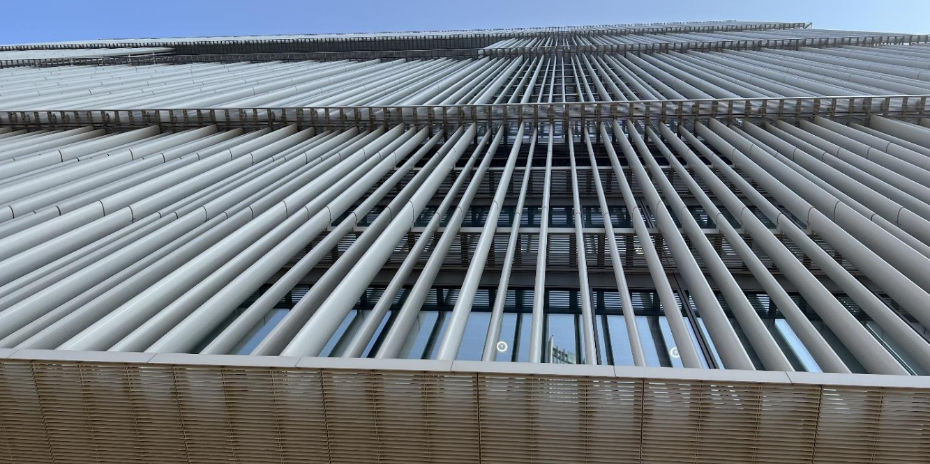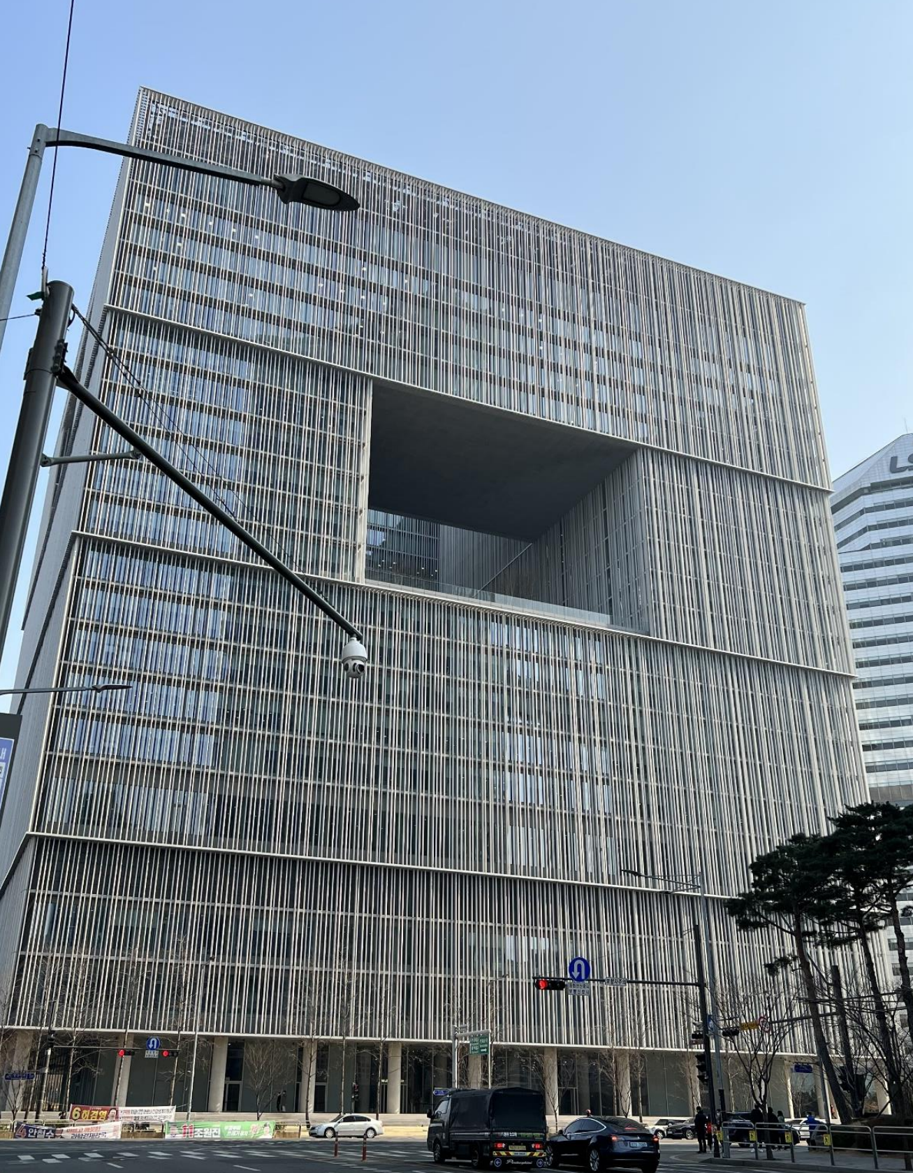 커튼월을 직접 노출시키지 않고 수직 알루미늄 루버(차양)를 사용했습니다.